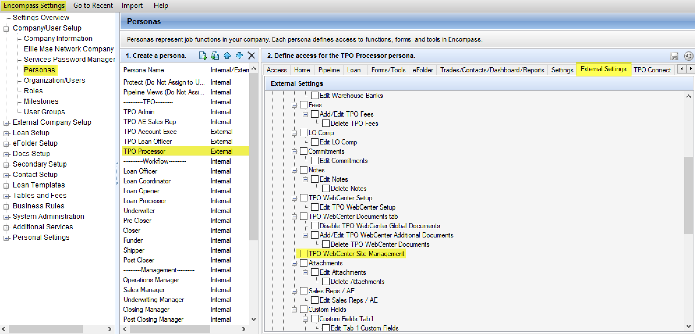 You can look in Settings>Personas>Select Persona>External Settings tab. If the “TPO WebCenter Site Management” setting does not display, then Encompass TPO WebCenter has not been provisioned. For questions around provisioning we recommend that you contact your EllieMae Account Manager.