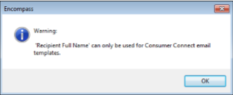 If you insert the Recipient Full Name field into a Consumer Connect template and then try to change it to a Non-Consumer Connect template, a warning message states that you cannot change the Loan Source to Non-Consumer Connect when the template contains the Recipient Name field.