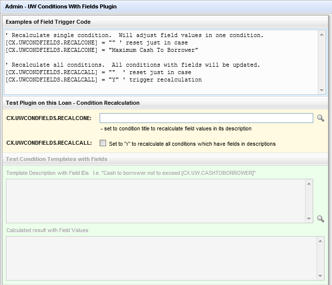 The UW Conditions with Fields plugin in Lender Toolkit’s PowerTools™ provides a way for Encompass Administrators to have certain conditions, or all conditions on a loan that have FieldIDs in their descriptions, to recalculate and update themselves with up to date information based on field triggers. Apart from setting it with field triggers, the custom fields that the plugin provides could simply be added to a custom input form for Underwriters so that by checking a box and closing the loan, they’ll know their conditions are up to date with any loan changes that might’ve been made prior to returning the loan to a Loan Processor.