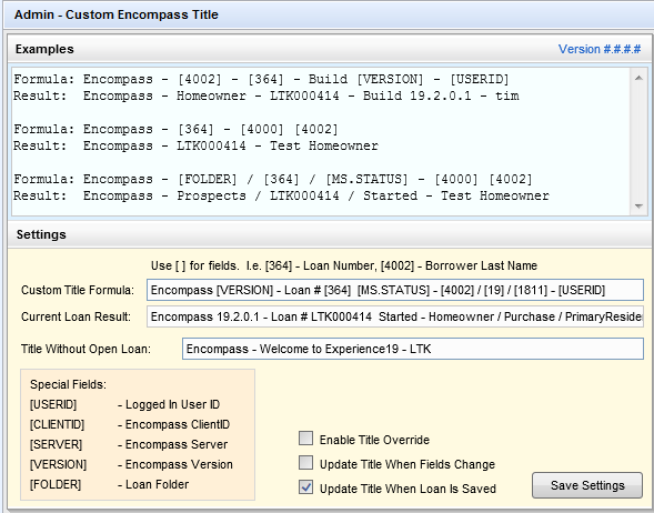 Lender Toolkit’s Custom Title Bar plugin allows Mortgage Lenders to update the Title Bar of Encompass with any text or loan data they’d like! The Title Bar can show their company name, the loan number, or other loan data through a dynamic editor that is easy to use.