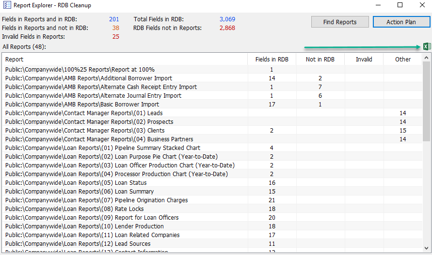 The Report Explorer plugin in Lender Toolkit’s PowerTools™ enables admins the functionality to review all the reports in an easy to use and fast-loading interface. It shows how many fields are in each report, how many of those fields are in the Reporting Database, if there’s any invalid fields that might be delaying or crashing reports, and much more. It can provide an easy to use Excel spreadsheet of fields to add to the reporting database to ensure that all the reports in your system run as fast as possible, without having to go into each report manually and research to find which fields are slowing down your reports.