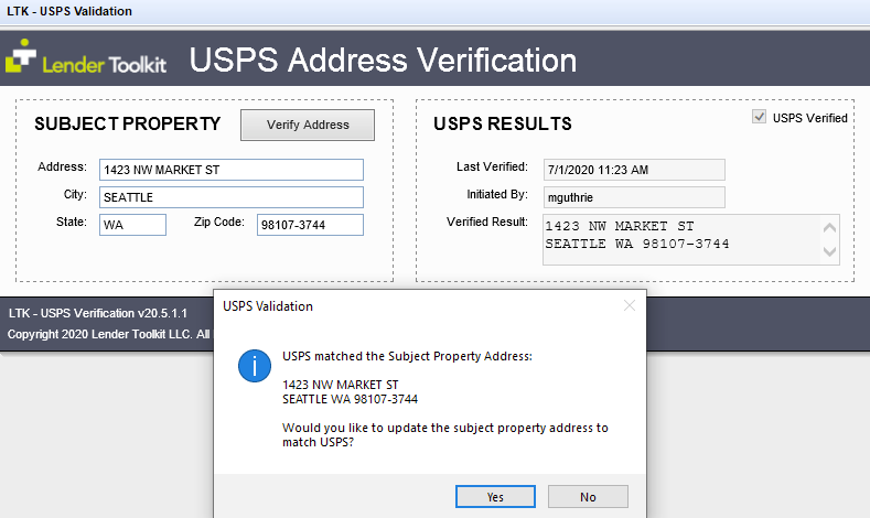 The USPS Verification tool was created to rid yourself of your old manual address validation process and bring some automation into your workflow. All you need to do is make sure the Subject Property Address is filled out (the zip code isn’t even required), go to the “LTK – USPS Validation” form, and click the “Verify Address” button. This will verify the address with USPS, and if you click the “Yes” button in the popup, it will automatically update the Subject Property Address with the valid address USPS uses.