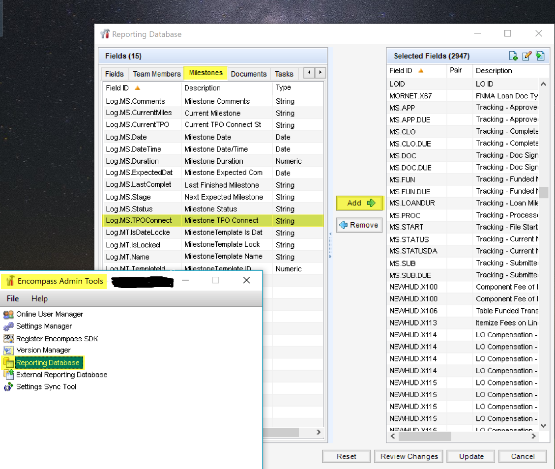The Log.MS.TPOConnectStatus field and Log.MS.CurrentTPOConnectStatus fields are virtual fields that are now available for administrators to add to their Reporting Database so they can monitor the status of Encompass TPO Connect loans in terms of what milestone the loan is currently at in the loan process. The Encompass® SDK has been updated to include these fields as a Property and can now be applied via the SDK.