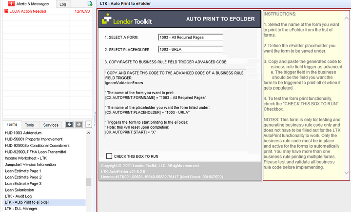 The Autoprint to eFolder tool gives Encompass Administrators a way to automate the form printing process via Trigger Rule. The tool allows the admin to select the print form and the eFolder destination. The tool “writes” the Advanced Trigger Code that can simply be copied and pasted to a business rule.