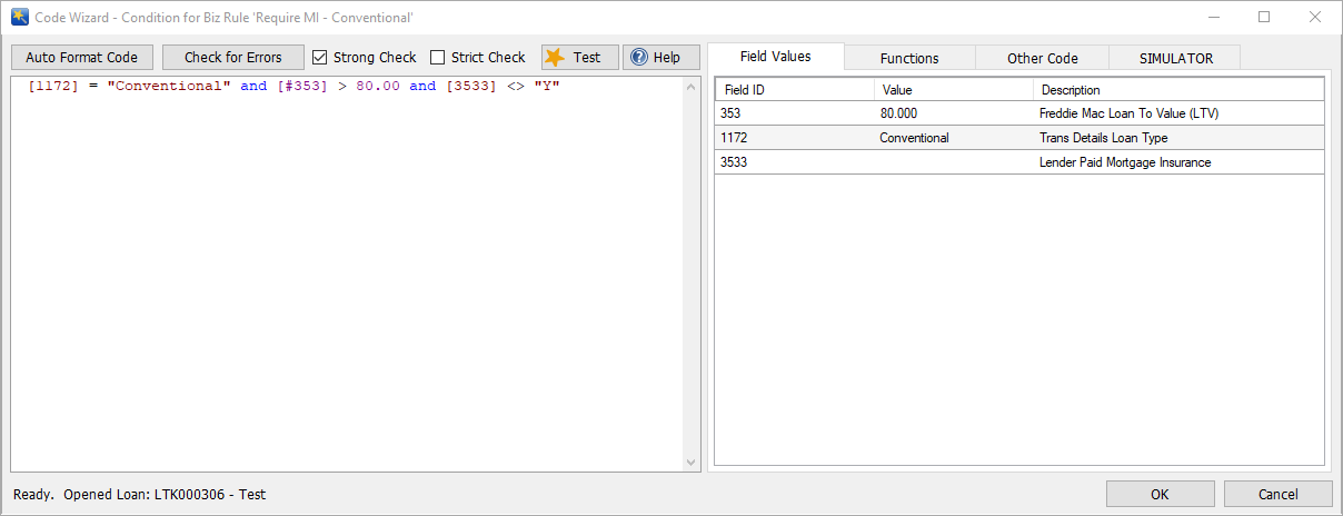 The Code Wizard plugin in Lender Toolkit’s Toolshed is a powerful tool for writing advanced code in Milestone Conditions, Field Triggers, or any other Encompass Business Rule Configuration screen. It provides powerful IDE-like (Integrated Development Environment) functionality such as Auto-Complete, Syntax Highlighting, Variable/Field Value monitoring, a Function dictionary and reference, as well as a robust Loan Simulator for testing your code without modifying an actual loan’s data.