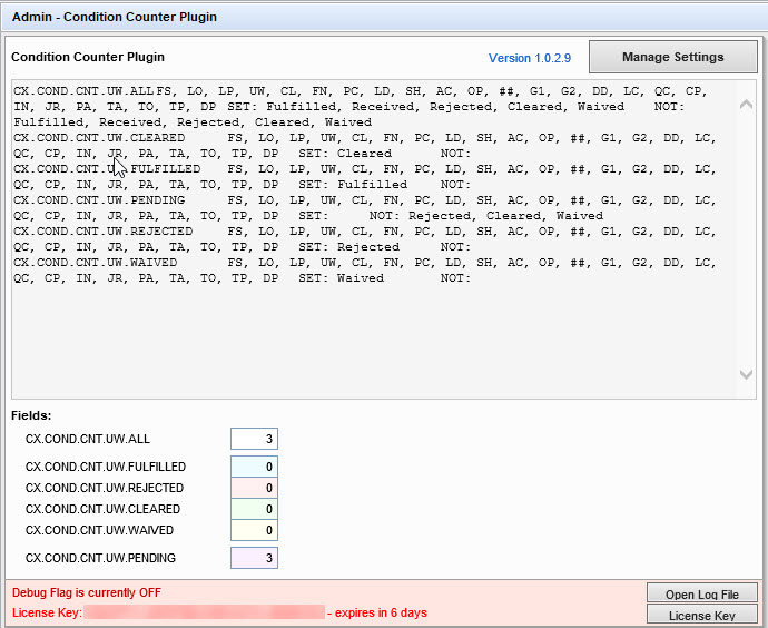 The Conditions Counter plugin in Lender Toolkit’s Toolshed keeps count of the number of conditions in a loan and places the values into custom fields that can be reported on. It comes with a robust configuration panel that can allow the tool to be expanded and show summaries for very specific condition scenarios. It can organize the counts by responsibility and status, and put those counts into new custom fields that the admin creates for those purposes.